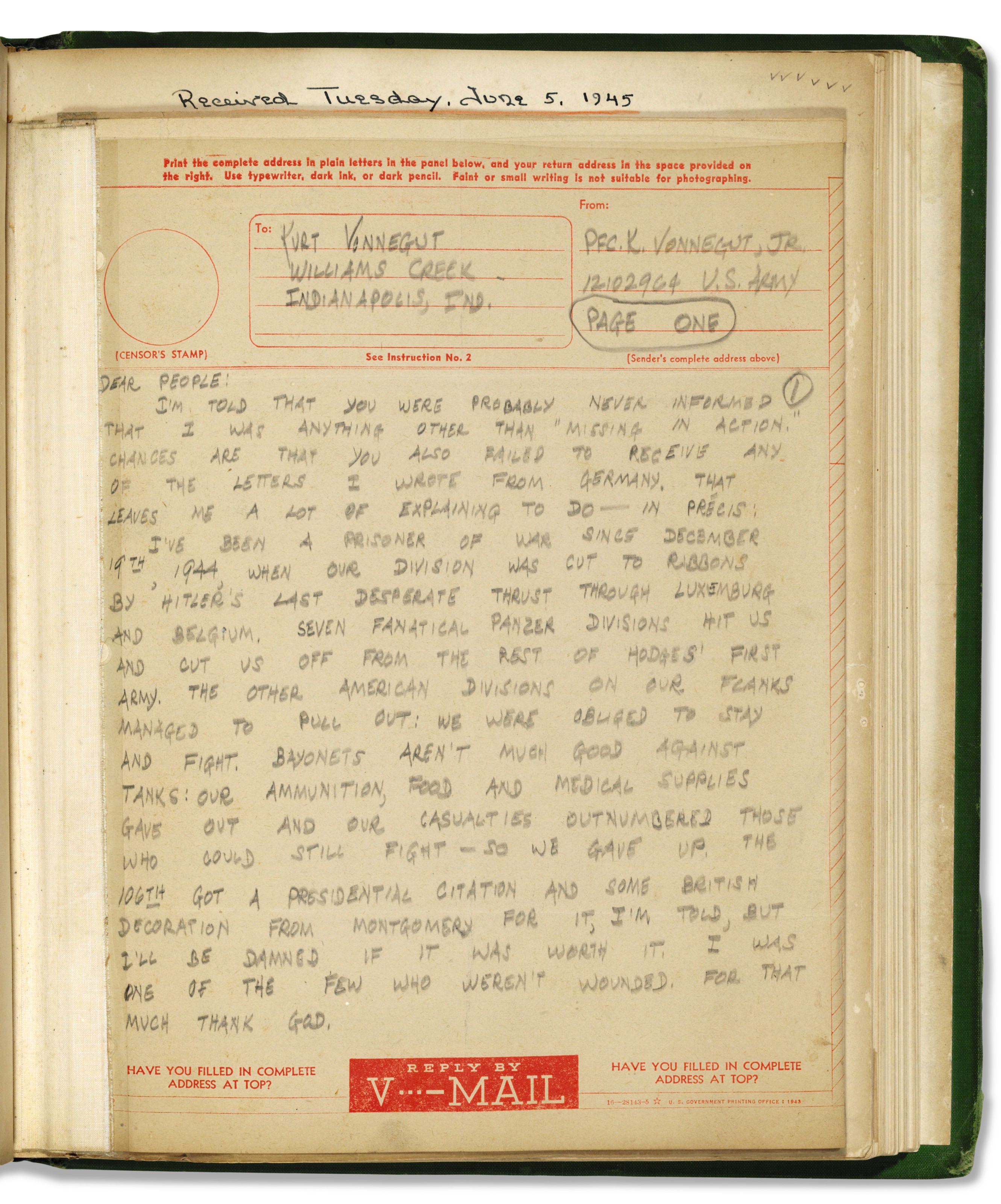 Бележникот од 84 страници, кој на една аукција во 2018 година се продал за 187.500 долари, вклучува 22 писма од Вонегат испратени на неговото семејство, слики кои младиот војник ги направил од разрушениот Дрезден и една телеграма од јануари 1945 година во која пишувало: „Војникот Курт Вонегат Џуниор е пријавен за исчезнат во акција“.