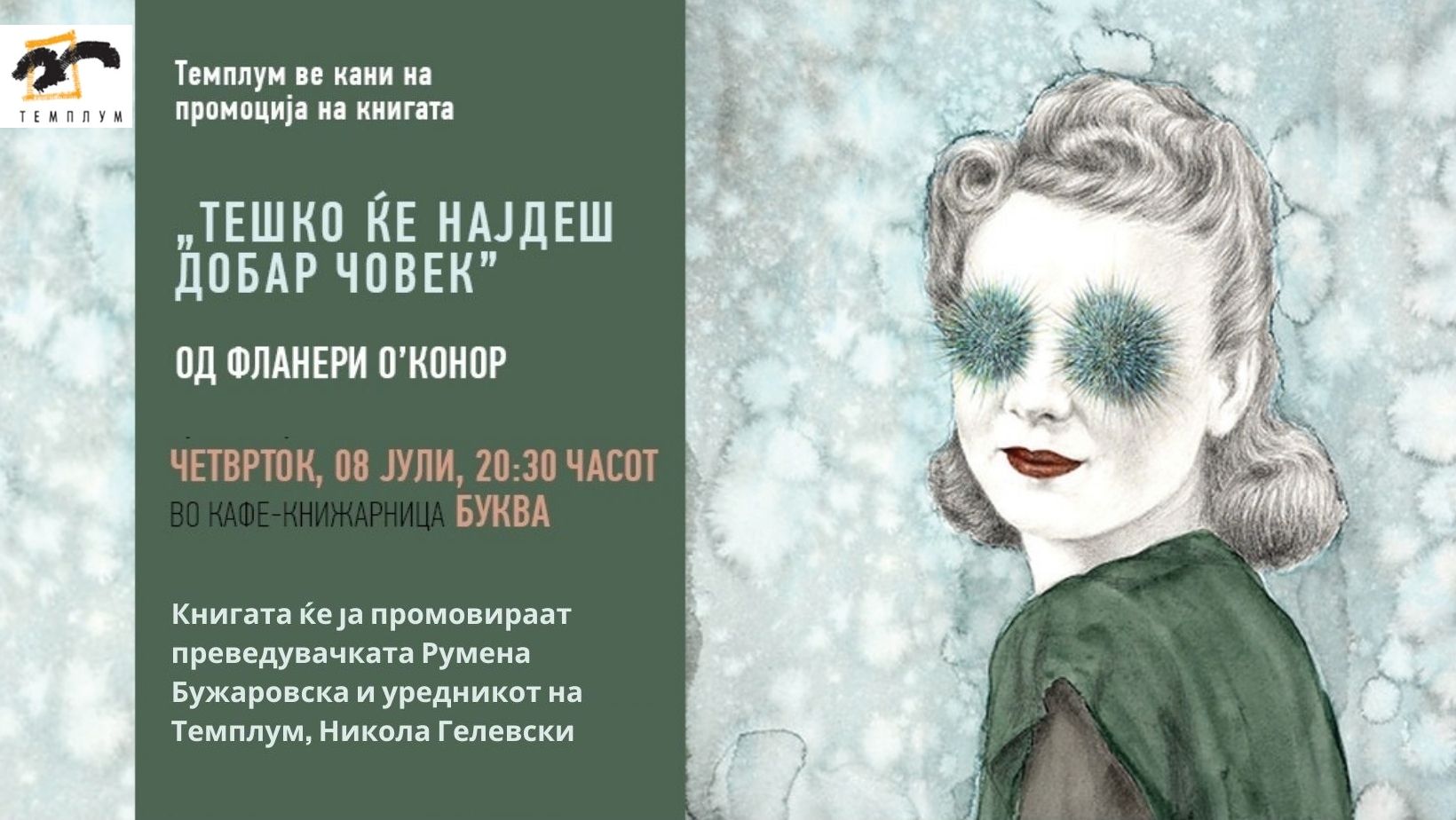 Со почеток од 20.30 часот во кафе-книжарницата „Буква“, ќе се одржи промоција на книгата „Тешко ќе најдеш добар човек“ од Фланери О’ Конор. Книгата ќе ја промовираат писателката и преведувачката Румена Бужаровска и Никола Гелевски, главниот уредник на Темплум, во чие издание е книгата.