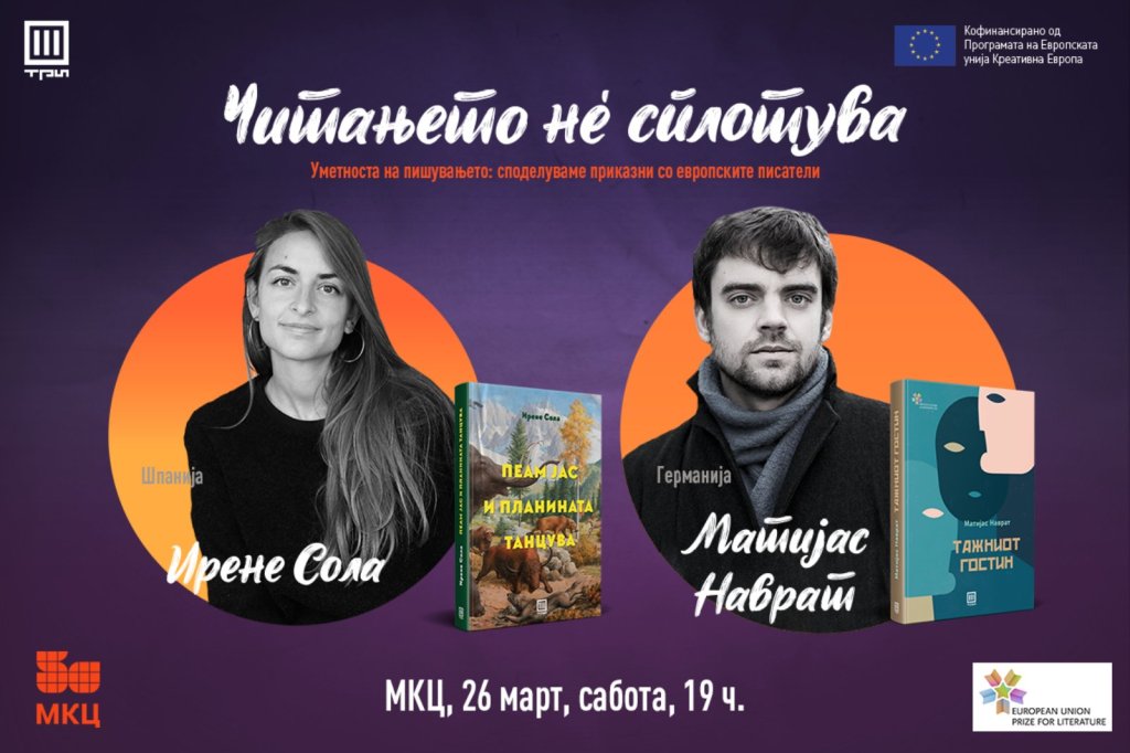 Одлична можност за сите љубители на книги: Утре, во Младински Културен Центар, ќе имате можност да присуствувате на несекојдневна средба со две големи европски имиња, шпанската писателка Ирене Сола (позната на нашата читателска јавност преку книгата „Пеам јас и планината танцува“) и германскиот писател Матијас Наврат („Тажниот гостин“), двајцата добитници на Европската награда за книжевност. Настанот ќе започне во 19 часот.