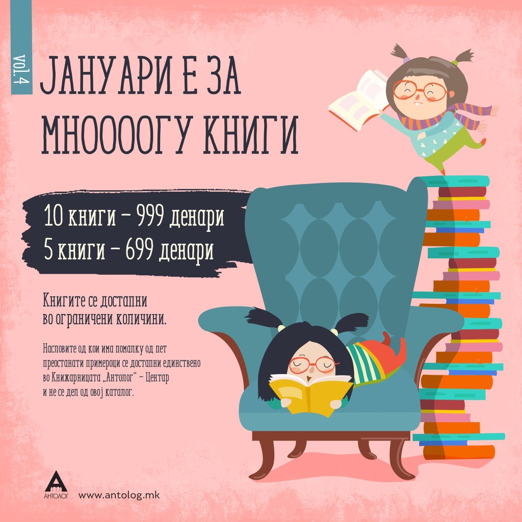 Книжевниот центар „Антолог“ оваа недела има одличпна акција за сите оние кои сакаат да си ја освежат домашната библиотека. Под мотото „Јануари е за многу книги“, до 15 јануари имате одлична можност да си направите пакет со книги од „Антолог“.