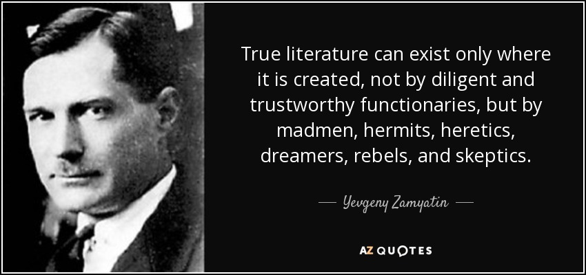(Цитат на Замјатин во кој вели: „Вистинската книжевност може да постои само онаму каде што е создадена, не од послушни и доверливи функционери, туку од лудаците, чудаците, еретиците, сонувачите, бунтовници и скептиците“.)