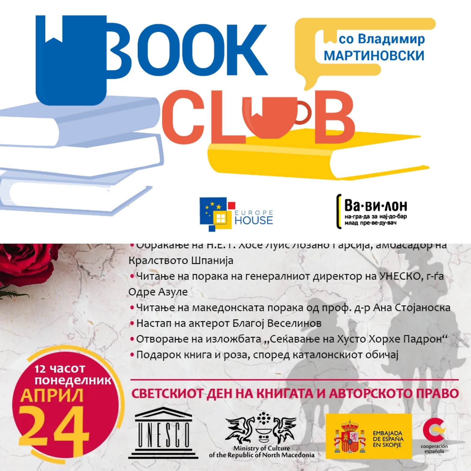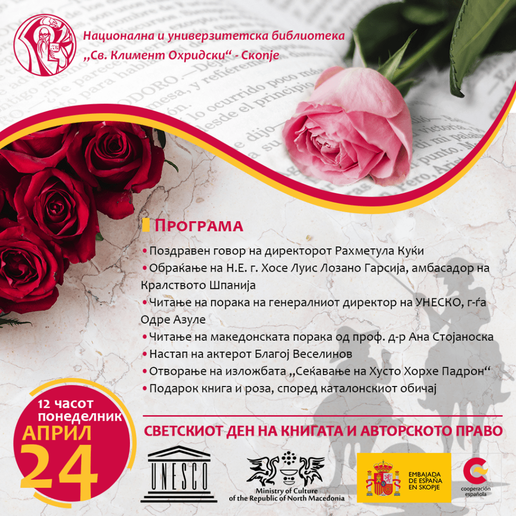 На 23 април традиционално се прославува Светскиот ден на книгата и авторските права, па така овој ден ќе биде одбележан и кај нас, со еден ден задоцнување, т.е на 24 април. Па така, во понеделник, 24 април, со почеток од 12 часот, во Национална и универзитетска библиотека „Св. Климент Охридски“ ќе се одржи настан кој има за цел да го одбележи Светскиот ден на книгата. На настанот присутните ќе имаат можност да ги слушнат обраќањата на директорот Рахметула Куќи и амбасадорот на Кралството Шпанија, Н.Е. Хосе Луис Лозано Гарсија, по што ќе следува читање на овогодинешната порака на генералната директорка на УНЕСКО, Одре Азуле, и македонската порака по повод Светскиот ден на книгата, прочитана од страна на проф. д-р Ана Стојаноска. По читањето на пораките, следи настап на македонскиот актер Благој Веселинов и отворање на изложбата „Сеќавање на Хусто Хорхе Падрон“, а ќе бидат поделени и книги и рози, според каталонскиот обичај!