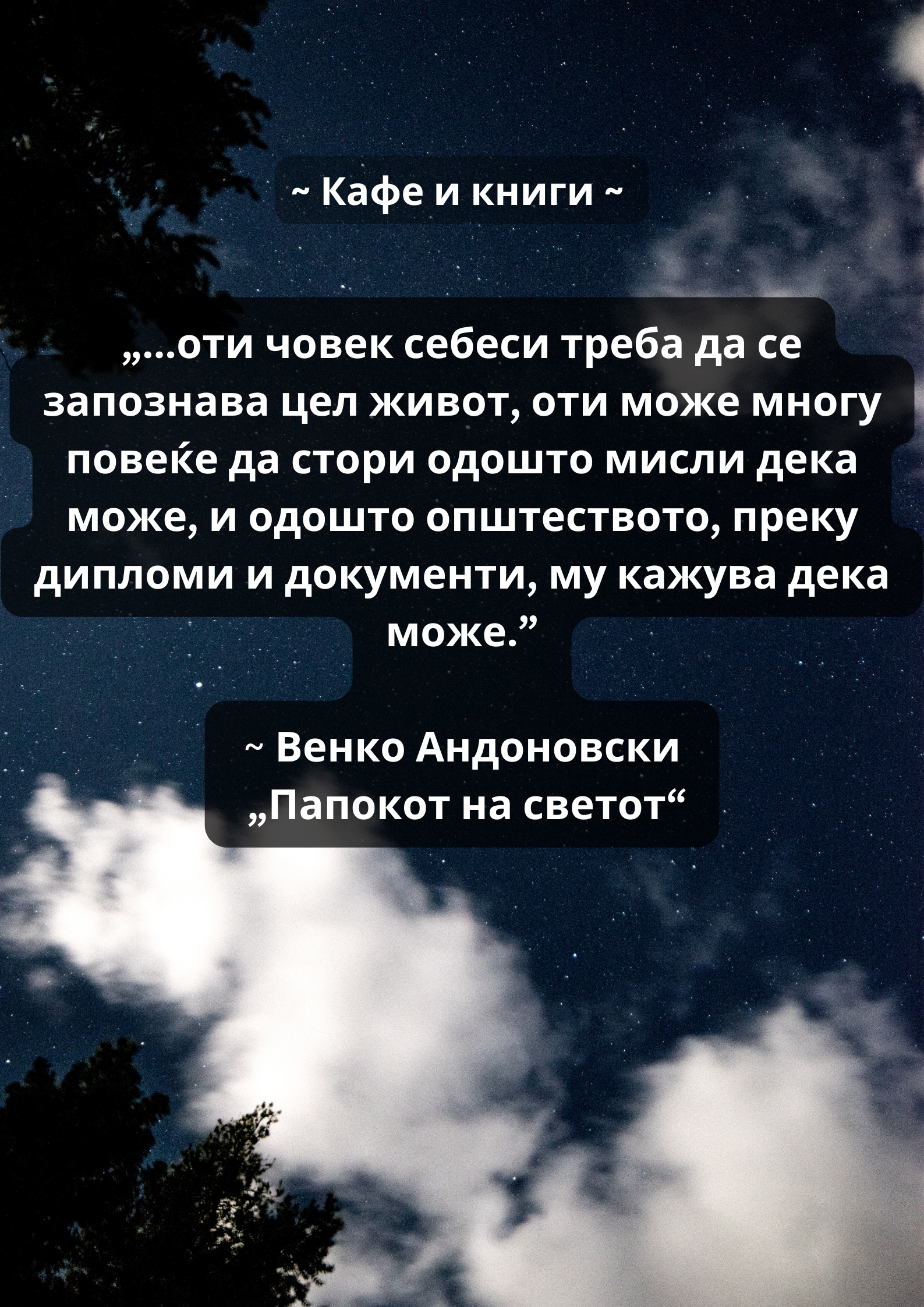 На денешен ден во 1964 година се родил познатиот македонски писател Венко Андоновски, кој во последно време е актуелен со неговиот последен роман „Папокот на светлината“, за кој ја доби наградата „Стале Попов“ и беше во најтесниот круг за изборот на „Роман на годината“. Во чест на неговиот роденден, денешната мисла на денот е од неговиот можеби и најпознат роман „Папокот на светот“. Доколку сакате да читате убави мисли од неговиот роман „Вештица“ тоа можете да го сторите тука.