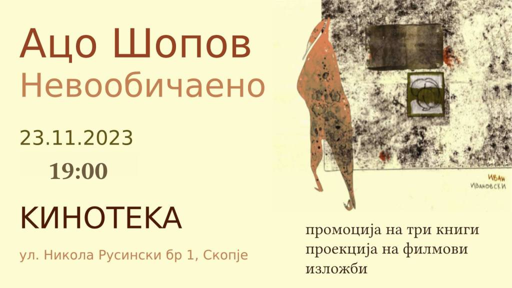 Во четврток, на 23 ноември, со почеток од 19 часот, во Кинотеката во Скопје ќе се одржи промоција на на три книги, а одделни фрагменти ќе заживеат на сцената благодарение на Софија Гогова-Врчаковска и на Емил Рубен, проекција на омнибусот „Небиднина“ и две изложби кои за првпат ќе бидат претставени на публиката.