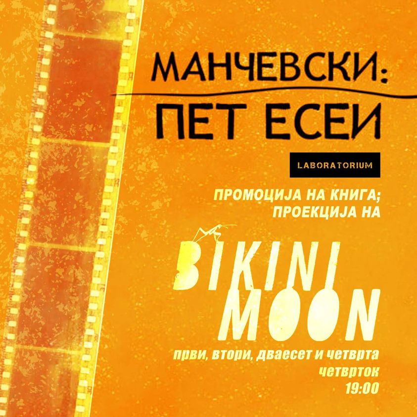 Во четврток (1 февруари), со почеток од 19 часот, во Едукативниот културен центар „Лабораториум“ ќе се случи промоцијата на „Манчевски: Пет есеи“, збирка од пет есеи на еден од најпознатите и најзначајни македонски режисери – Милчо Манчевски, по што ќе следи промоција на неговиот филм „Бикини мун“ од 2017 година.