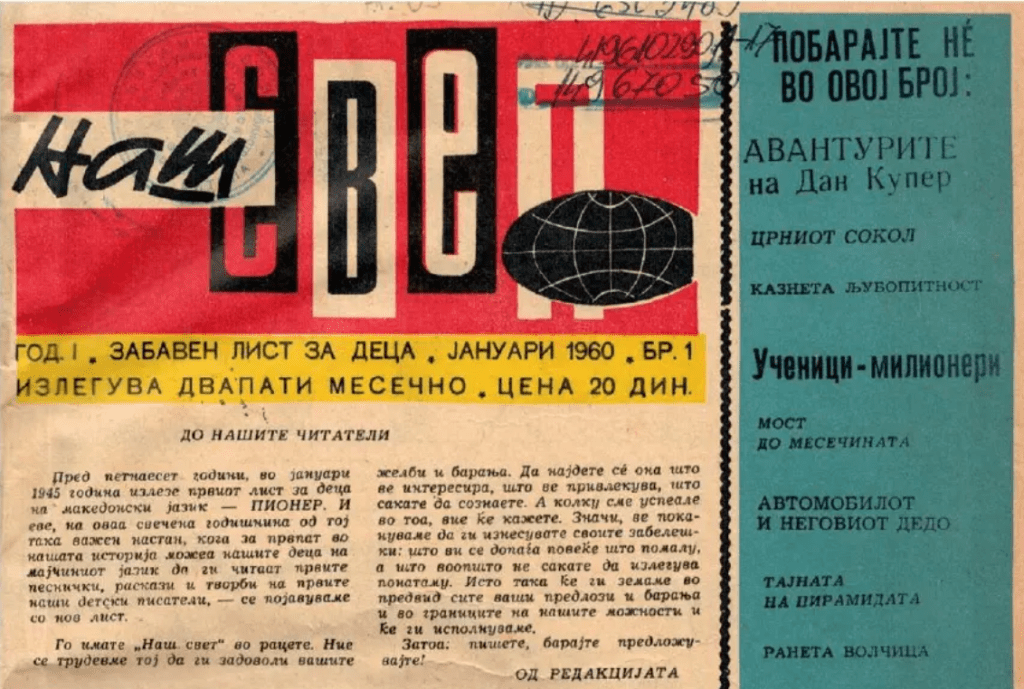 На социјалната мрежа Фејсбук случајно налетав на линк до првото издание на „Наш свет“ и решив да го споделам и со вас, доколку не сте знаеле како изгледа првото издание да го разгледате, а доколку се сеќавате, да се потсетите на стари спомени. Имено, првиот број на „Наш свет“ излегол во јануари 1960 година, во издание на редакцијата „Детска радост“ на издавачката куќа „Просветно дело“. Како што се наведува во описот на линкот кој можете да го најдете подолу, ова списание го уредувале некои од најеминентните имиња во македонската литература како Васил Куновски, Симон Дракул, Ванчо Николески, Видое Подгорец, Киро Донев и Рајко Јовчевски.