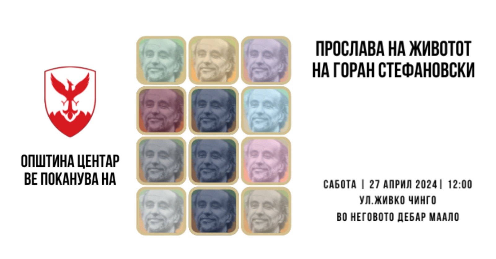 На 27 април го чествуваме денот на раѓањето на Горан Стефановски! По тој повод, општина Центар организира настан токму на 27 април (сабота) со почеток од 12 часот, пред муралот на Горан Стефановски, кој се наоѓа во Дебар маало, спроти слаткарницата „Зафир“. Неодамна беше насликан до него и уште еден мурал со стихот од песната „Скопје“ од Леб и сол „Насмевни се, не бери гајле, намигни ми, ајде на здравје, Скопје“, нацртан од уметниците Драш и Мачка.