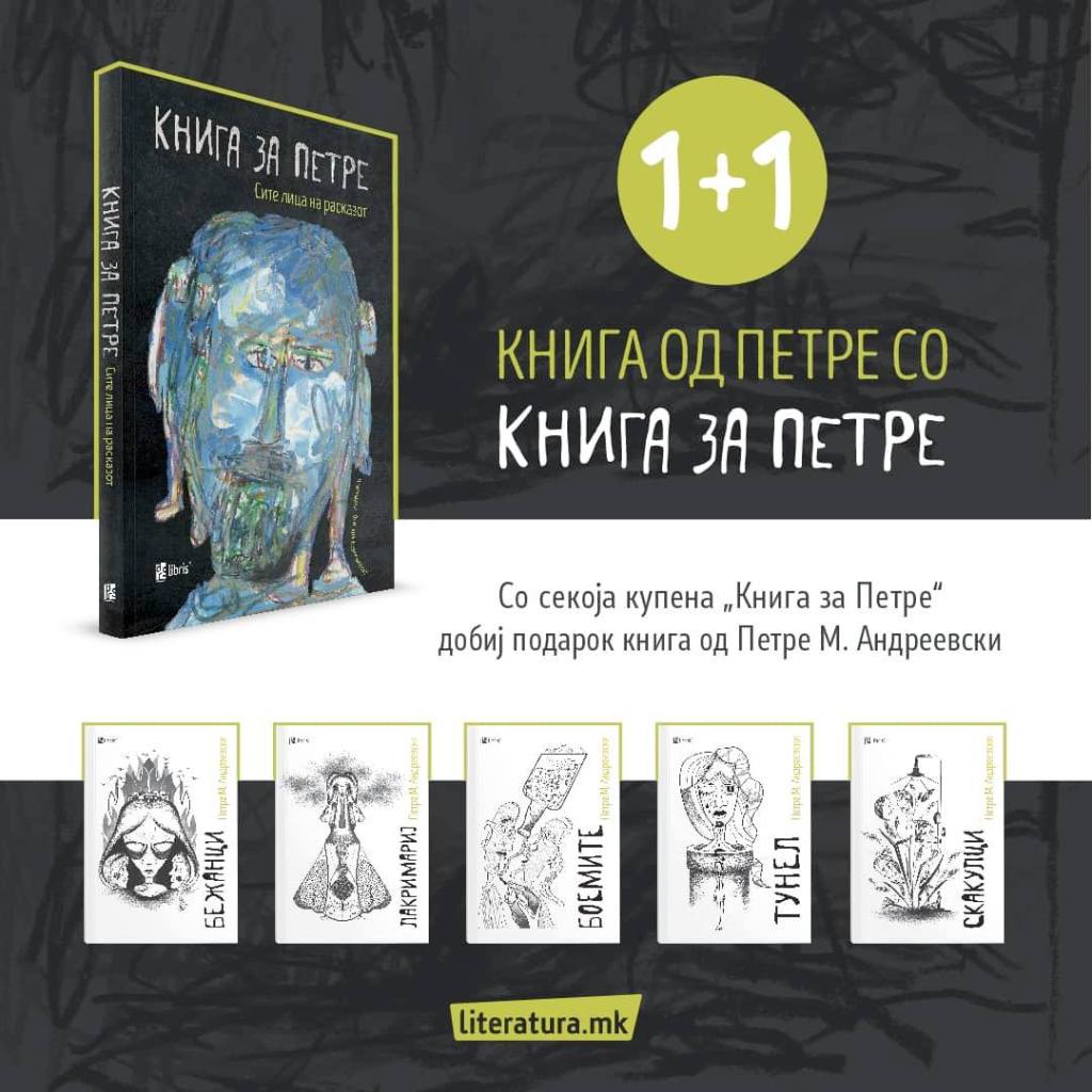 Со цел да се одбележи овој важен јубилеј, 90 години од раѓањето на Петре М. Андреевски, како и да се промовира книгата, до недела (30.06), во книжарниците на „Литература.мк“ и на интернет преку www.literatura.mk, со секоја купена „Книга за Петре“ следува подарок книга од Петре М. Андреевски. Акцијата важи за сите книги од Петре М. Андреевски објавени од издавачката куќа „Арс Ламина“: „И на небо и на земја“, „Вечна куќа: тажаленки“, „Скакулци“, „Последните селани“, „Дални наковални“, „Бежанци“, „Лакримариј“, „Боемите“; Пофалби и поплаки“, „Тунел“.