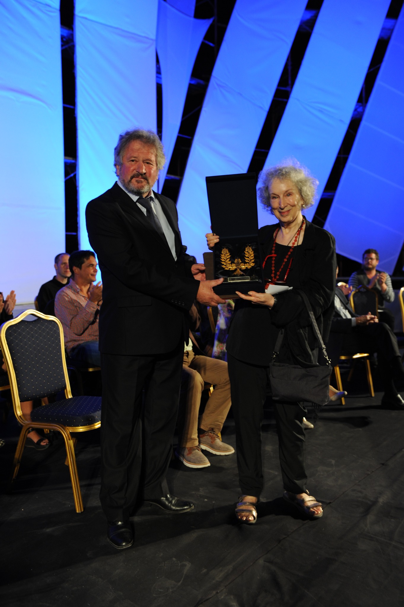 (Маргарет Атвуд сликана со тогашниот претседател на Управниот одбор на СВП, Славе Ѓорго Димоски при врачување на „Златниот Венец“