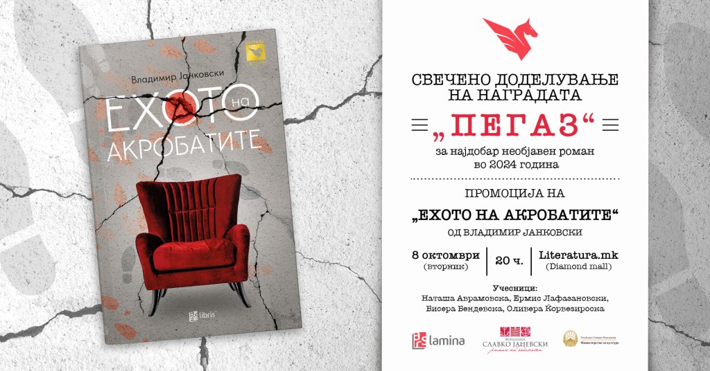 Денес (8 октомври), со почеток од 20 часот, во книжарницата „Литература.мк“ во „Дајмонд мол“, ќе се одржат свеченото доделување на наградата „Пегаз“ за 2024 година и промоцијата на победничкиот роман „Ехото на акробатите“ од Владимир Јанковски.