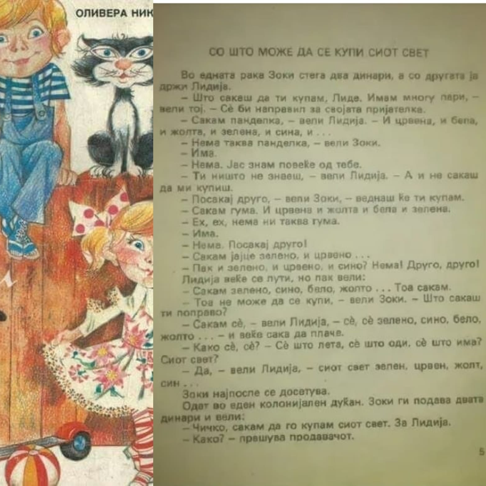 Вчера многу се пишуваше за нејзиниот живот и творештво, а најдобриот начин да се слави животот на еден писател е тоа да се споделуваат неговите дела и мисли. Вчера размислував за тоа колку ја сакав „Зоки Поки“ кога бев мала и колку книгите што ги читаме како деца нè обликуваат како личност. Омилен расказ од „Зоки Поки“ ми беше оној кога Зоки ѝ го купи сиот свет на Лидија и тоа за два денари… Сиот шарен свет со толку многу бои. Па тоа некако ме инспирираше да го пронајдам тој извадок и да го споделам со вас во чест на Оливера Николова и најпознатото книжевно момче од македонската книжевна сцена.