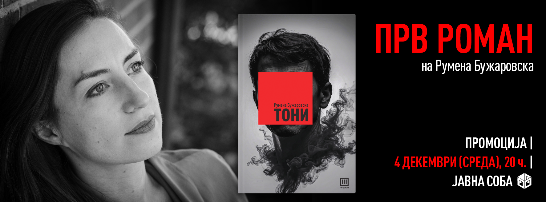 Денес (4 декември) во „Јавна соба“, со почеток од 20 часот ќе се одржи и промоцијата на романот, а промотори на романот и централниот лик ќе бидат поетесата, основачка и главна уредничка на „Медуза“, Калиа Димитрова, и македонскиот писател Петар Андоновски. Во меѓувреме, на страницата на ТРИ можете да прочитате и извадок од романот за да ѕирнете во приказната.