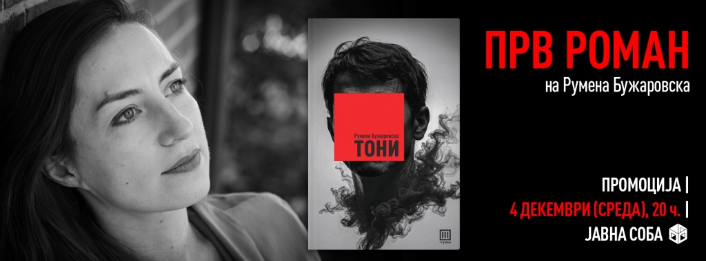 Румена Бужаровска сега на македонската јавност ќе ѝ се претстави и со својот прв роман – „Тони“, исто така во издание на ТРИ. Според описот, дејството на романот се врти околу Тони, средовечен бивш рокер од Скопје, кој живее со мајка му и работи во државна институција. Во текот на пандемијата, ненамерно, но по своја вина, предизвикува неколку настани кои засекогаш го менуваат неговиот, а и животот на луѓето околу него.