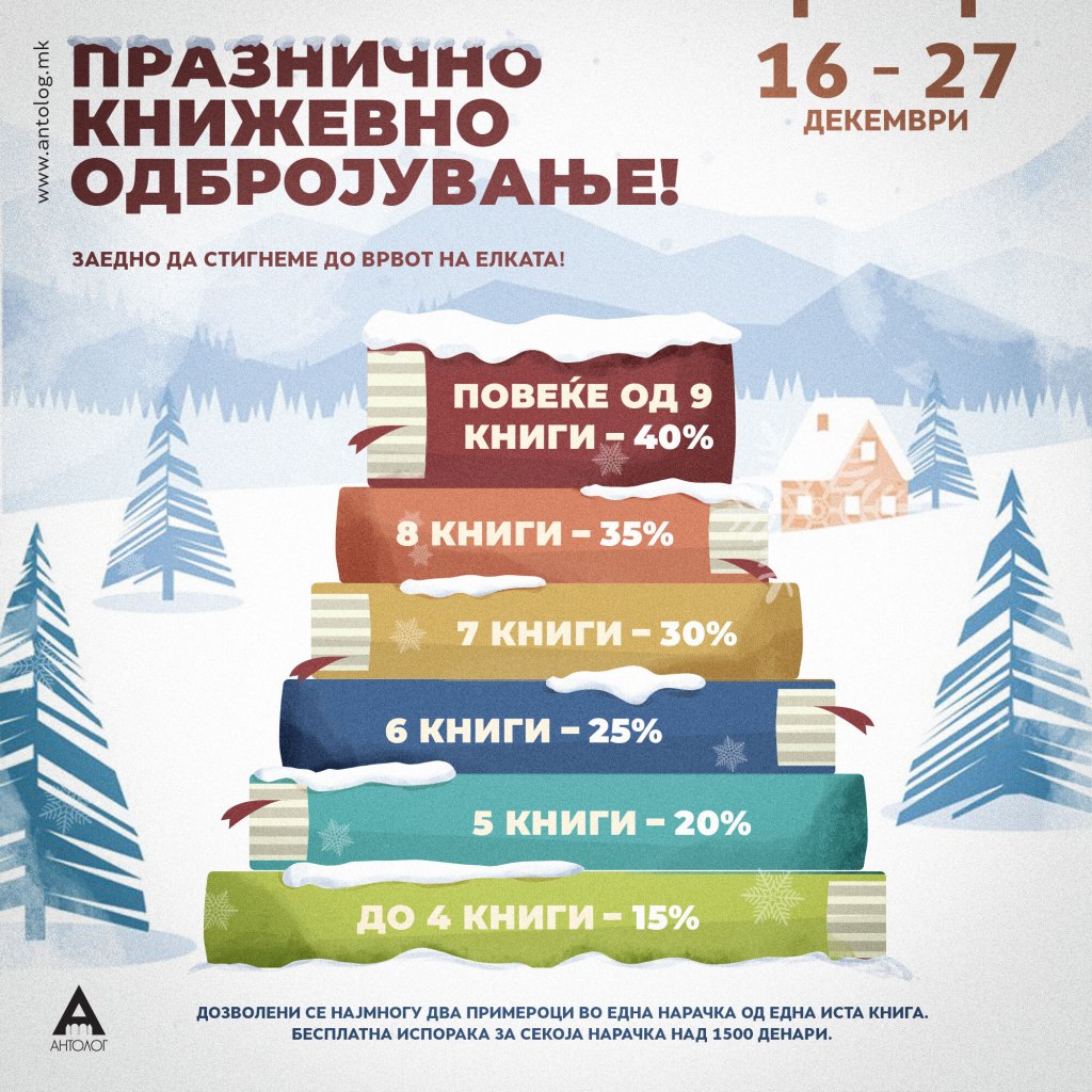 Во периодот од 16 до 27 декември, во книжарницата на „Антолог“ и на нивната веб-страница, ќе имате можност да си изберете книги со скалест попуст, па така, доколку купите до 4 книги, ви следува 15% попуст, за 5 книги ви следуваат 20% попуст, за 6 книги – 25%. Скалата продолжува сè до 40% за 9 или за повеќе книги! Ви следува и бесплатна достава за нарачки над 1500 денари!