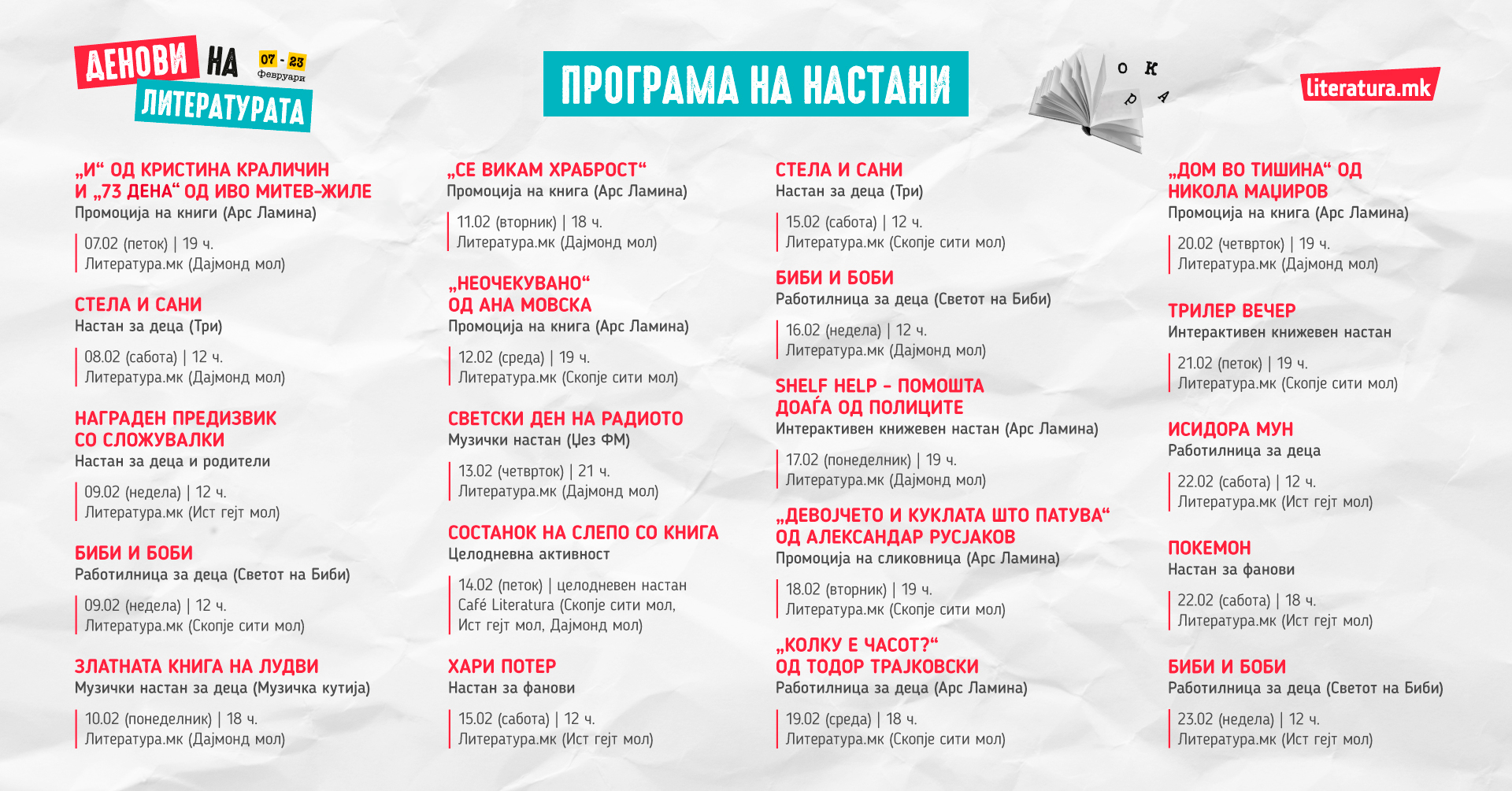 Што се однесува до програмата за настани истата можете да ја погледнете подолу, а за повеќе информации околу самата акција и настани, следете ја официјалната страница на „Литература.мк“ на Фејсбук, како и нивниот официјален настан на Фејсбук.