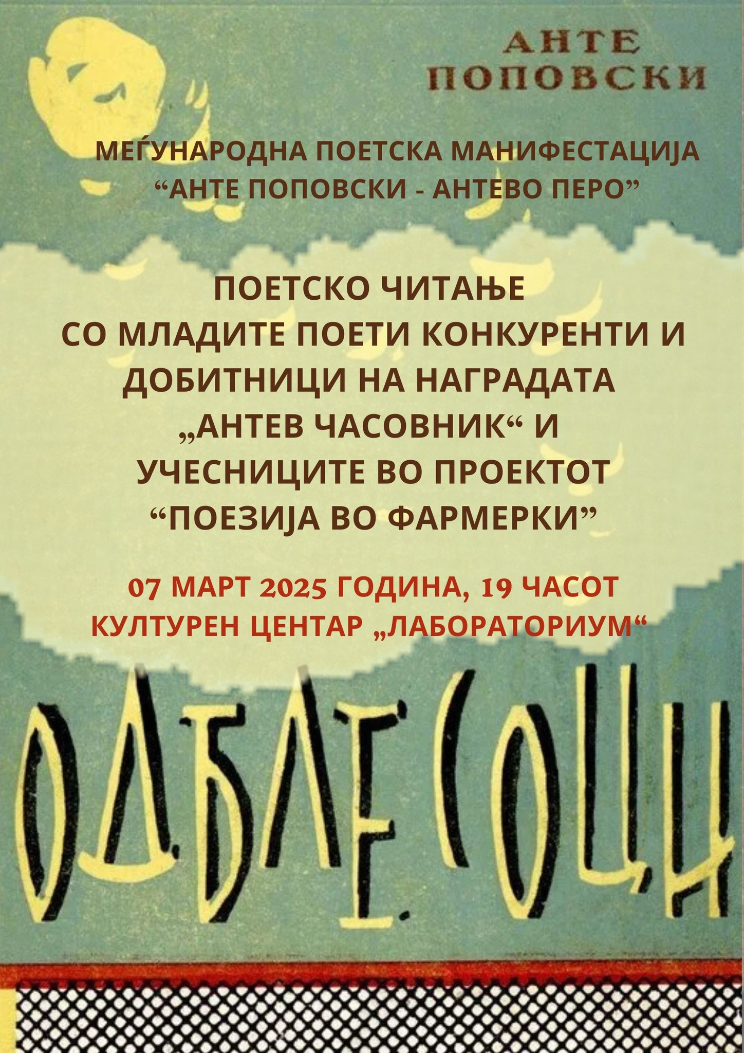 Во чест на 70-годишнината од издавањето на првата стихозбирка на Анте Поповски, утре, (7 март), со почеток во 19.00 часот во Културниот центар „Лабораториум“ ќе се одржи поетското читање „Одблесоци“ во организација на Здружението за зачувување на делото на Анте Поповски – „Антево перо“.