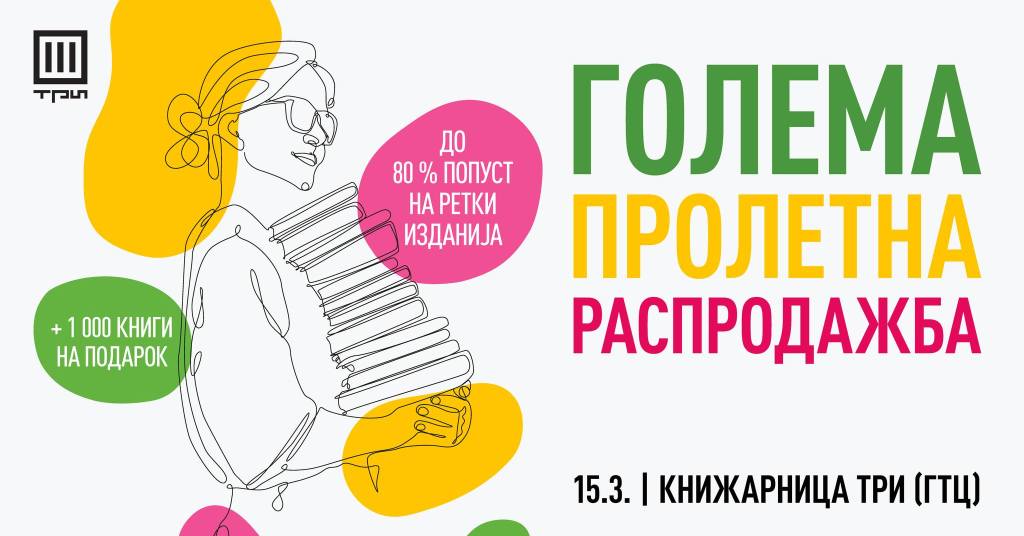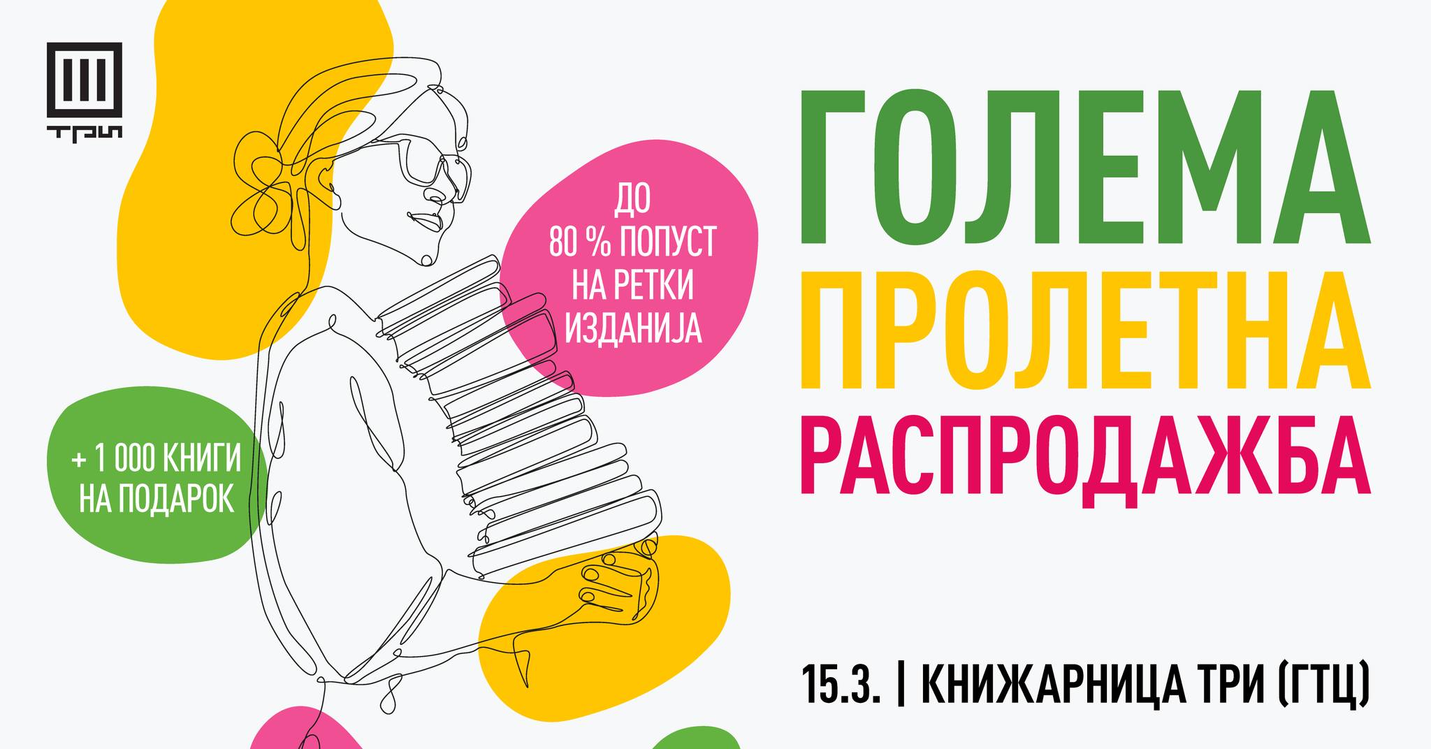Пролетта само што не дошла, тоа значи прекрасни сончеви денови, зеленило и расцутување, но и одлично време за читање книги. Доколку сакате да си ја освежите домашната библиотека, утре (15 март, сабота), со почеток од 9 часот, пред книжарницата на ТРИ во Градскиот трговски центар (ГТЦ), ќе се одржи целодневна, пролетна распродажба на стари и ретки изданија, на која многу книги ќе бидат со неповторливи цени и до 80 % попуст.