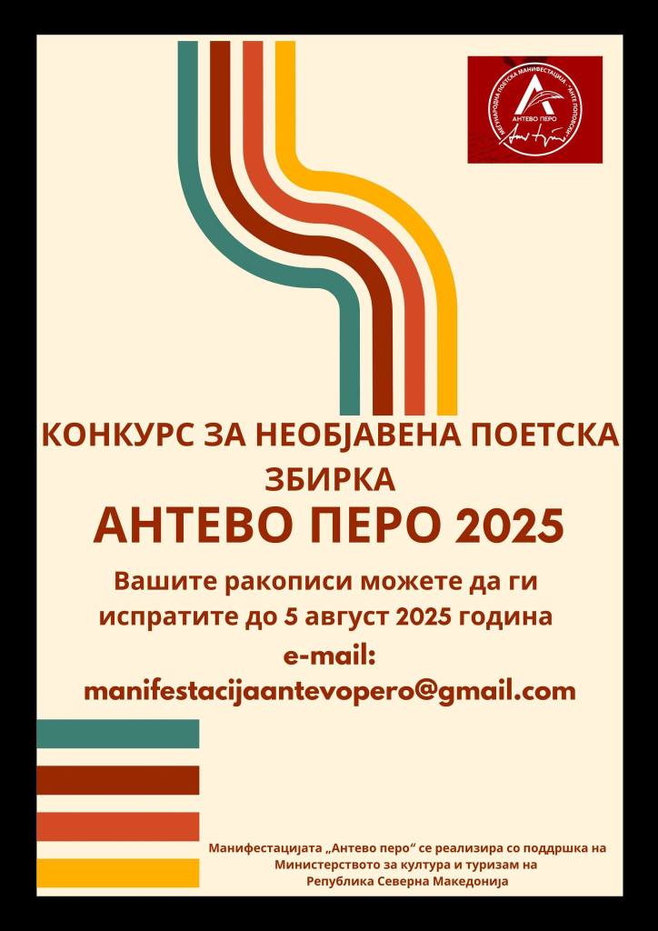 Доколку пишувате поезија и досега не сте ја објавиле, имате можност да се пријавите на конкурсот за наградата „Антево перо“ за 2025 година., востановена во чест на творештвото на бардот на современата македонска поезија, Анте Поповски. Наградата „Антево перо“ за 2025 година се доделува како исклучително македонско поетско признание за необјавена поетска книга т.е поетски ракопис.
