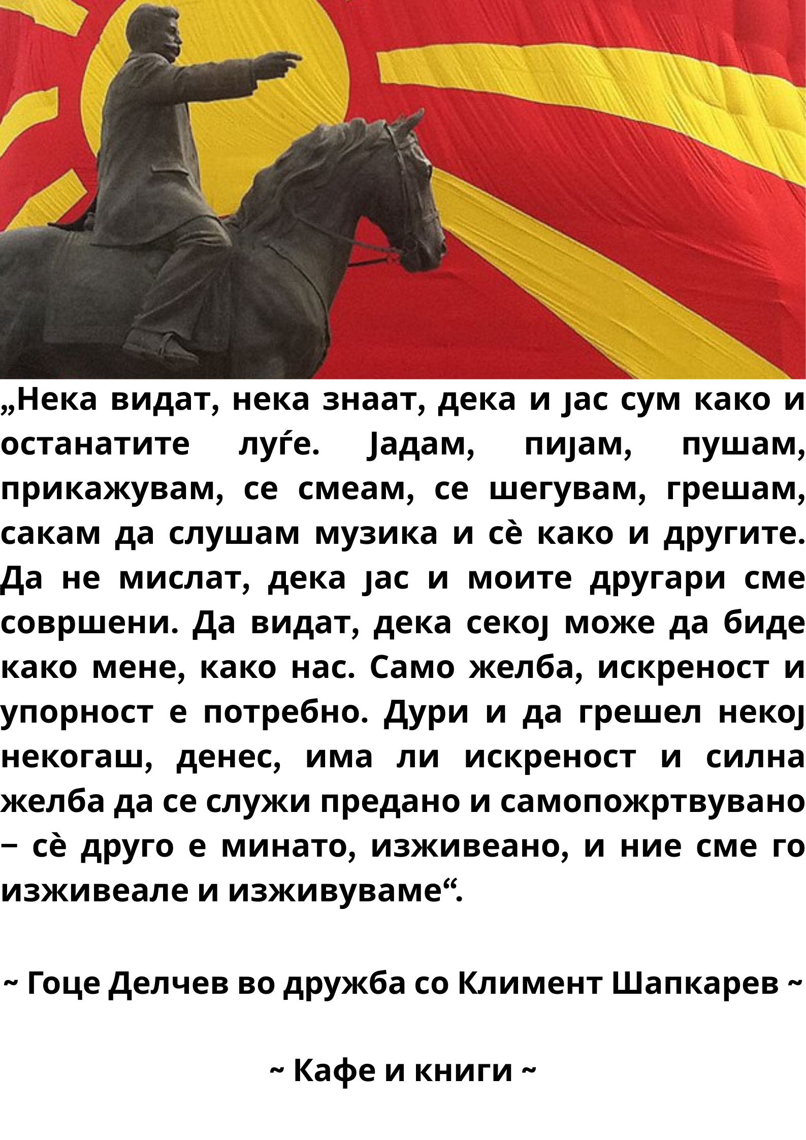 Денеска се одбележуваат 122 години од смртта на Гоце Делчев, кој загинал во Баница на 4 мај 1903 година. Гоце Делчев е еден од најголемите македонски револуционери, кој се залагал за македонската борба за слобода и државност. Во негова чест денес читаме една негова интересна мисла кажана во дружба со Климент Шакпарев, која првично беше објавена во одличниот текст на „Нова Македонија“, „Човекот што ја направи Македонија подобро место за сите луѓе“ напишан од Далибор Станковиќ.
