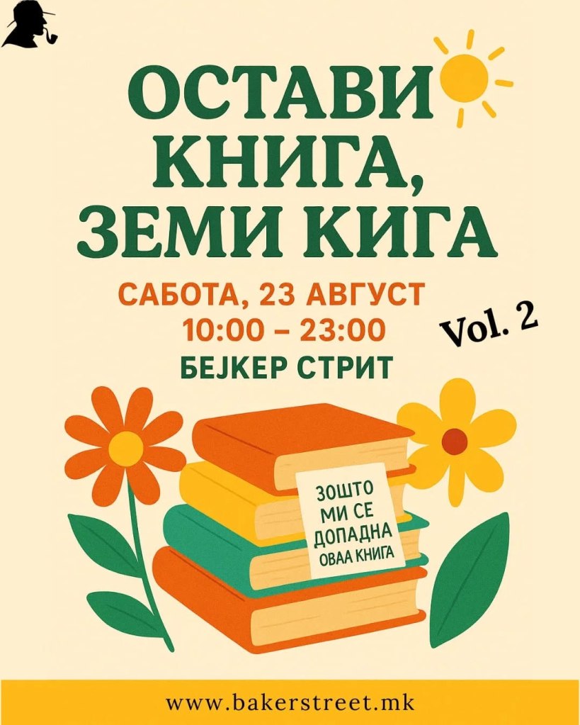 Оца е вториот ваков настан што ќе се организира и идејата е да дојдете со книга и да ја оставите во замена со друга книга. Како што велат од „Бејкер стрит“ на нивните профили на социјалните мрежи, тие ќе го започнат циклусот со избрани наслови од нивните приватни библиотеки, како и со „книгите кои не си најдоа свој дом на минатиот настан“.