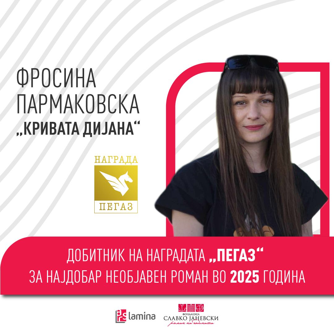 Ракописот со наслов „Кривата Дијана (роман за верижната вина)“ од Фросина Пармаковска, е добитник на книжевната награда „Пегаз“ за најдобар необјавен роман во 2025 година. Во соопштението на „Арс Ламина“ се наведува дека во најтесниот избор влегле и романите: „Пацер“ од Коста Бојчески, „Изгубени низ дупки во џебовите“ од Ники Борас (Владо Јаневски) и „Солдат 1882“ од Добре Тодоровски.
