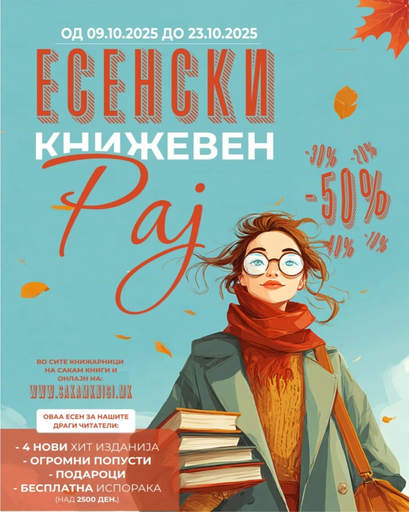 Октомври е месец на есента, но и месец на многу книжевни акции. Денес започна и голема книжевна акција на „Сакам книги“ и ќе трае сѐ до 23 октомври. Како што е наведено на нивните профили на социјалните мрежи, четири нови изданија на „Сакам книги“ ќе бидат намалени за 20%. Се работи за „Кодот на Катерина“ од Јорн Лиер Хорст, „Кога жеравите летаат на југ“ од Лиса Ридзен, „Салто“ од Арндис Тораринсдотир и „Проколната земја“ од Клер Лесли Хол.