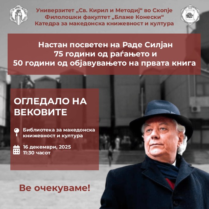 По повод 75 од раѓањето на македонскиот поет, есеист, критичар, преведувач и основач на „Матица македонска“, како и 50 години од објавувањето на неговата прва книга, утре (16 декември) со почеток од 11:30 часот во Библиотека за македонска книжевност и култура ќе се одржи настан на кој ќе се чествува животот и творештвото на Раде Силјан.