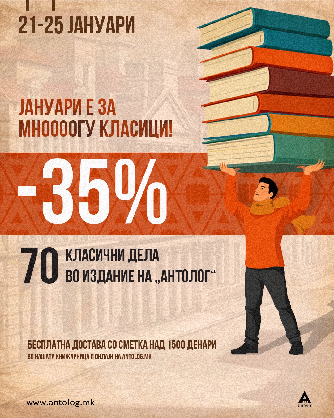 Доколку сте обожаватели на класици, од денес (21 јануари) па сѐ до 25 јануари, можете да се упатите во книжарницата на „Антолог“ или да ја посетите нивната веб-страница, затоа што во текот на овие денови класиците во нивно издание ќе бидат намалени за 35%. Меѓу нив се и дела на Достоевски, Толстој, Ман, Стивенсон, Андриќ, Селимовиќ и многу други. За сметка над 1500 денари, доставата е бесплатна.