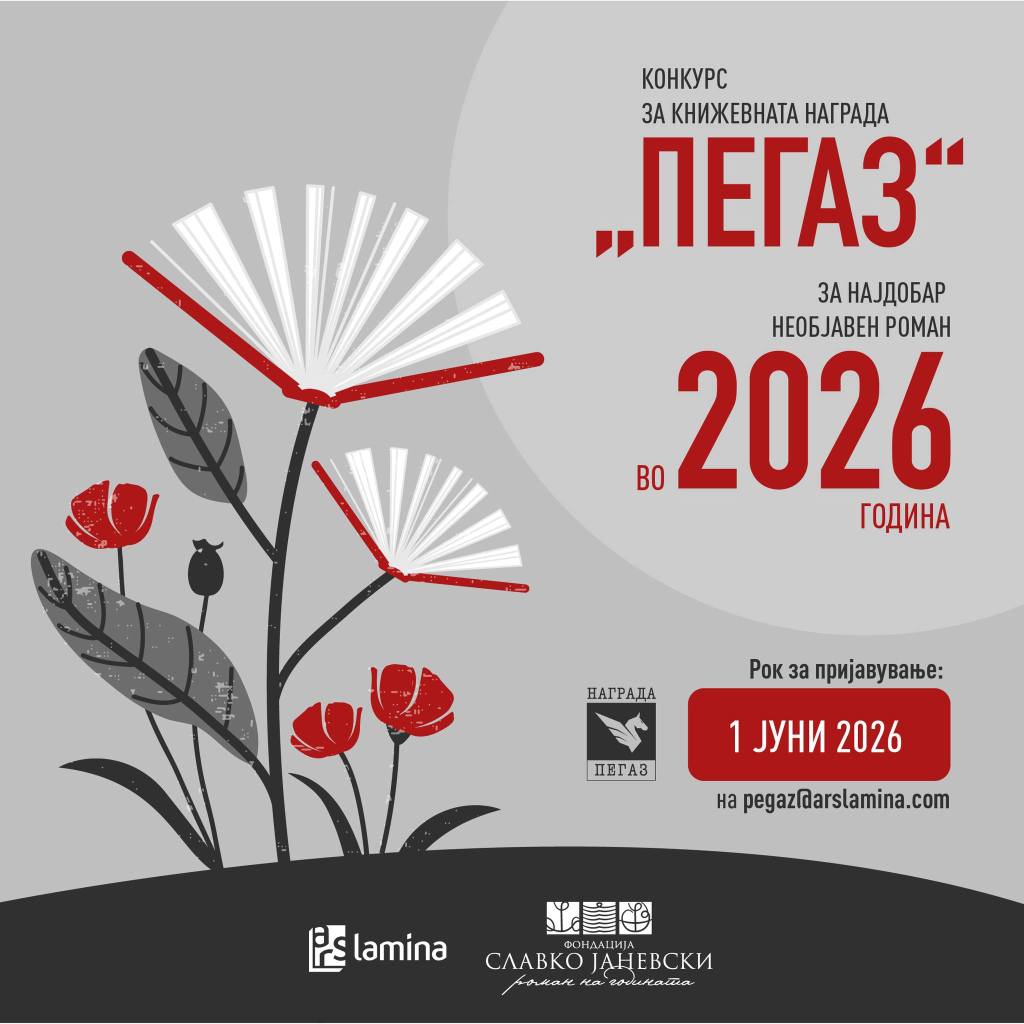 Доколку сте писател(к)а со замислен концепт и напишан (неиздаден) роман, имате можност да се пријавите на осмиот конкурс за наградата „Пегаз“ за најдобар необјавен роман во 2026 година! Рокот на испраќање на ракописите е до 1 јуни 2026 година, а добитникот на наградата, востановена од издавачката куќа „Арс Ламина“ во соработка со Фондацијата за унапредување и промоција на културните вредности „Славко Јаневски“, ќе биде објавен на 2 септември оваа година.