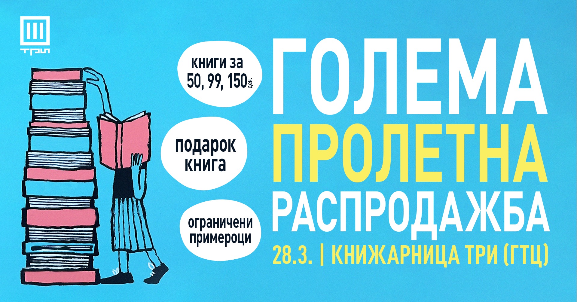 Пролетта пристигна и тоа е одличен период за обновување на домашната библиотека, па ако тоа е она што ви треба, книжарницата на ТРИ во ГТЦ најавува еднодневна распродажба на книги што ќе се одржи на утре (сабота, 28 март), во периодот од 10 до 18 часот.