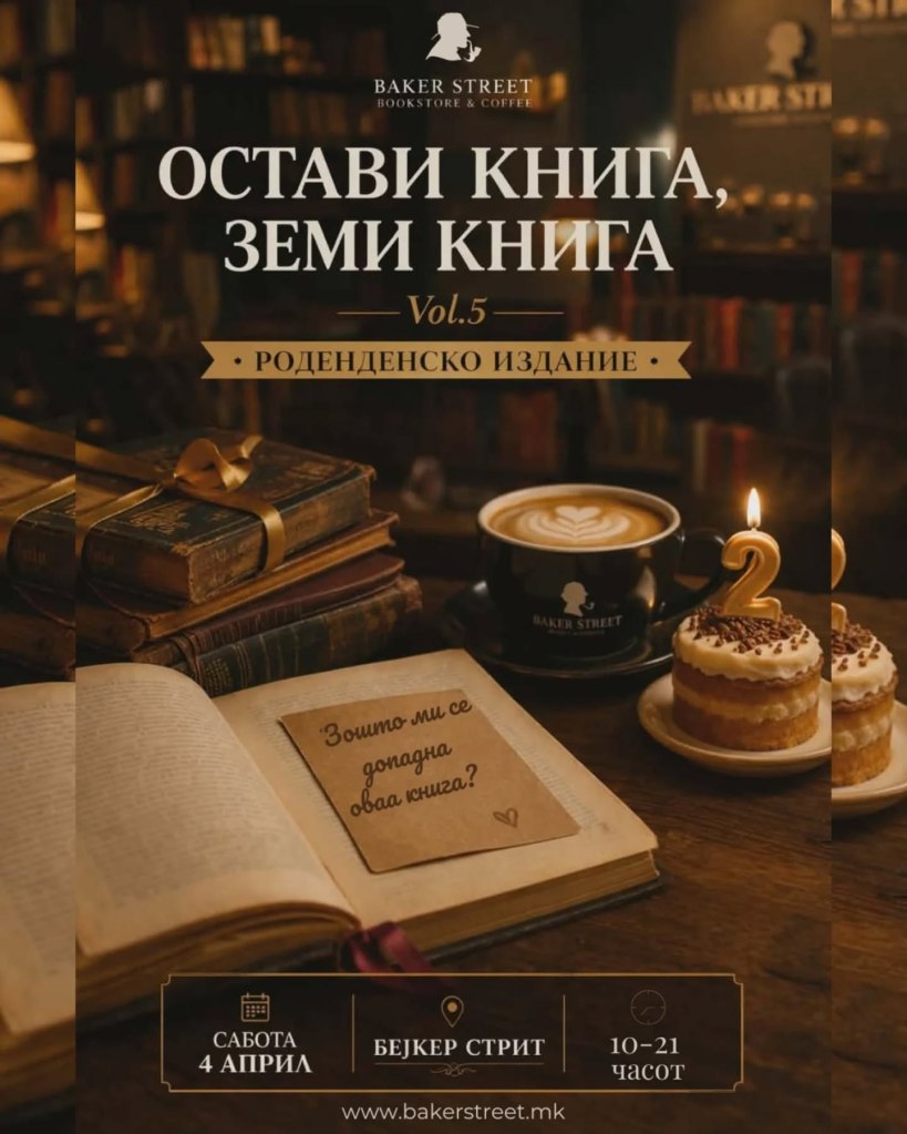 Кафе-книжарницата „Бејкер стрит“ деновиве слави две години постоење и по тој повод, утре (сабота, 4 април), во периодот од 10 до 21 часот, во кафе-книжарницата организираат роденденско издание на нивната акција „Остави книга, земи книга“, кое воедно е и петто издание на овој настан.