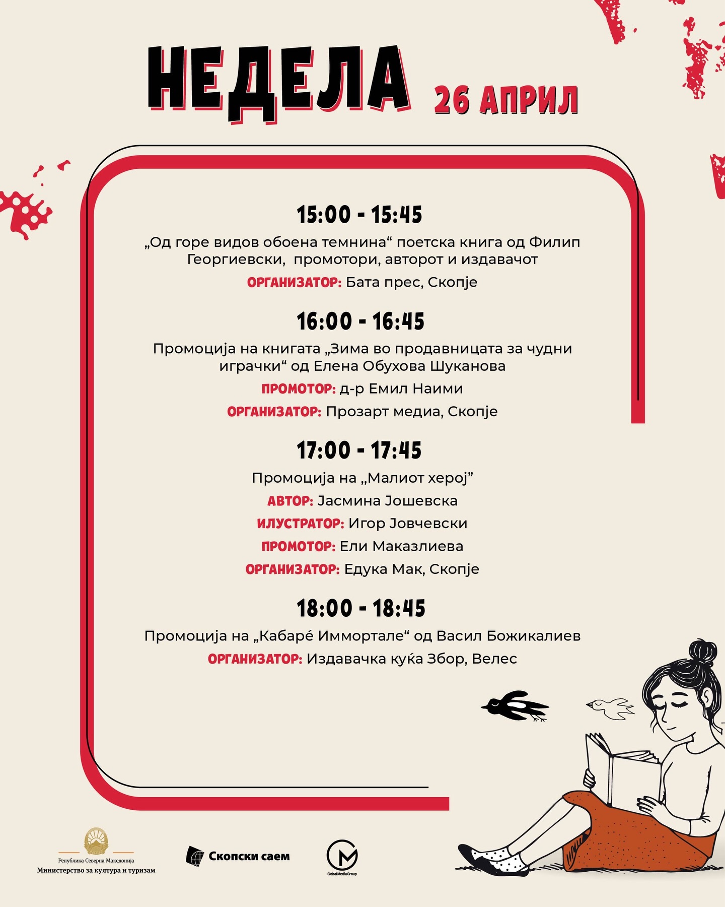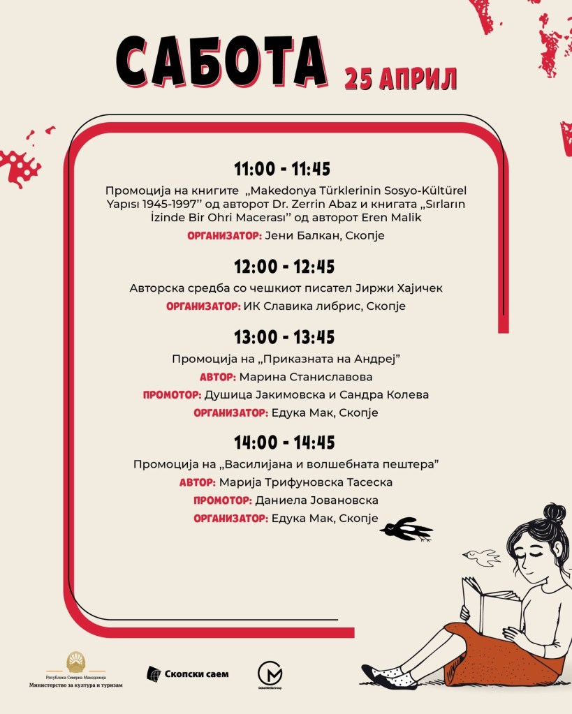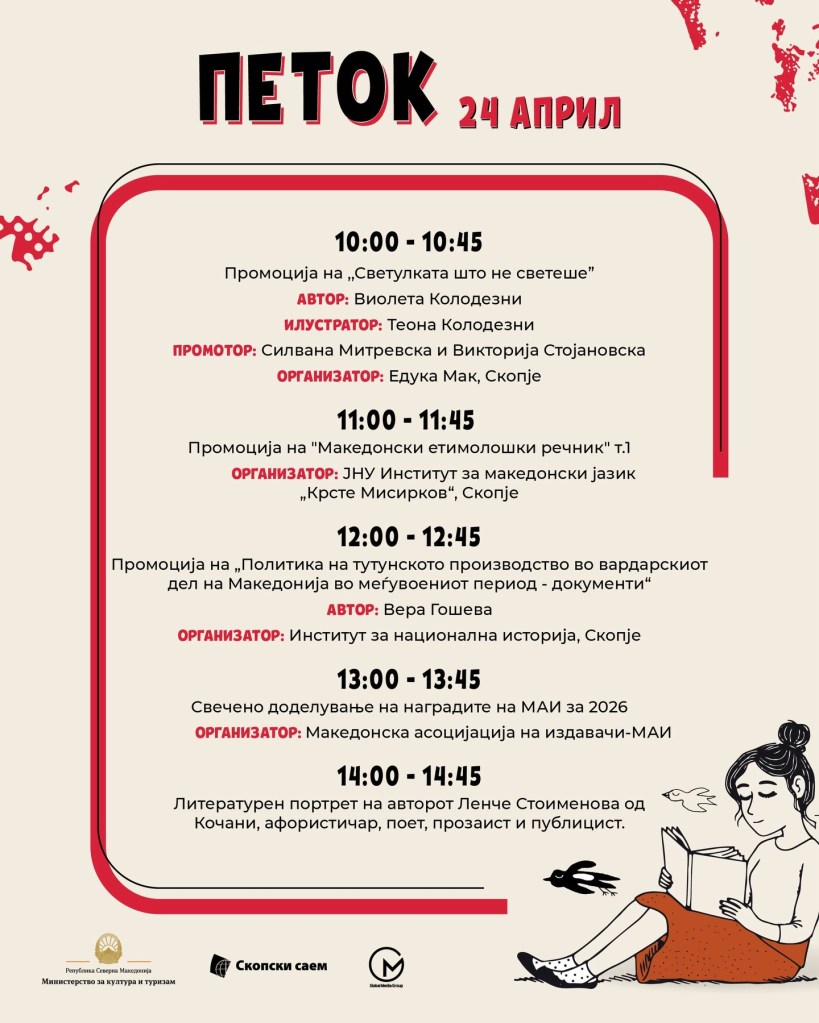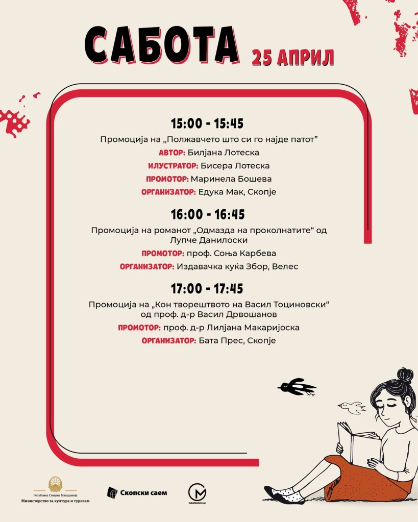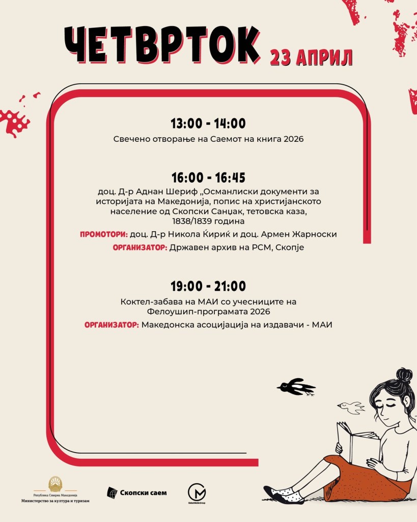 Денес, на Светскиот ден на книгата, започнува новото издание на Саем на книга! Овие неколку дена ќе бидат вистински празник и задоволство за сите љубител(к)и на книги. Од 23 до 29 април, во Арена „Борис Трајковски“ во Скопје ќе имате можност да поминете часови со вашите омилени книги и да додадете нови книги кон вашата домашната библиотека.